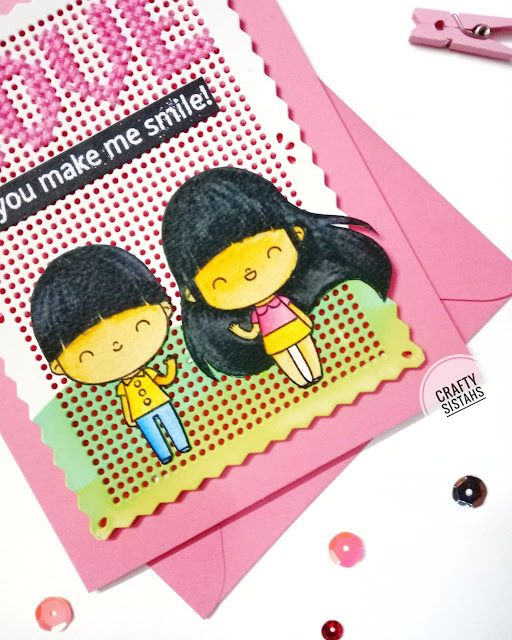 We generally don't use colored card bases, but pink card base suits well for this card. This card stock is a new addition to our stash and we used it immediately (the day we bought it).
